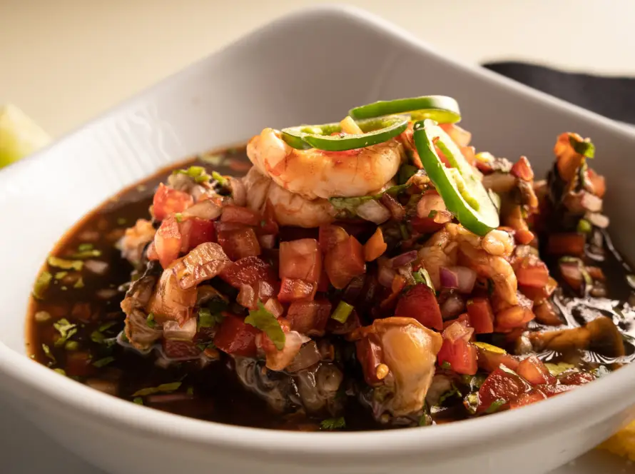 Ceviche fresco con aguacate en cubos, cebolla morada y cilantro, balance perfecto de frescura.