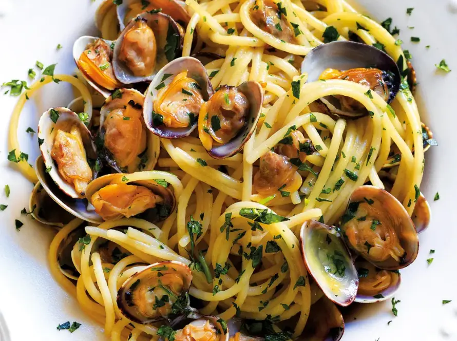 Pasta con almejas frescas, aceite de oliva y vino blanco, receta clásica italiana.